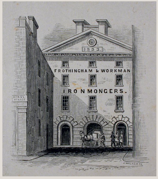 He found employment with a hardware firm, Frothingham & Co., and within a few years he became a partner. As of 1836, the company was known as Frothingham and Workman, and it became the largest wholesale hardware company in Canada, selling scythes, shovels, augers and nails. When William retired from the hardware business in 1859, his brother Thomas took over running the company.2