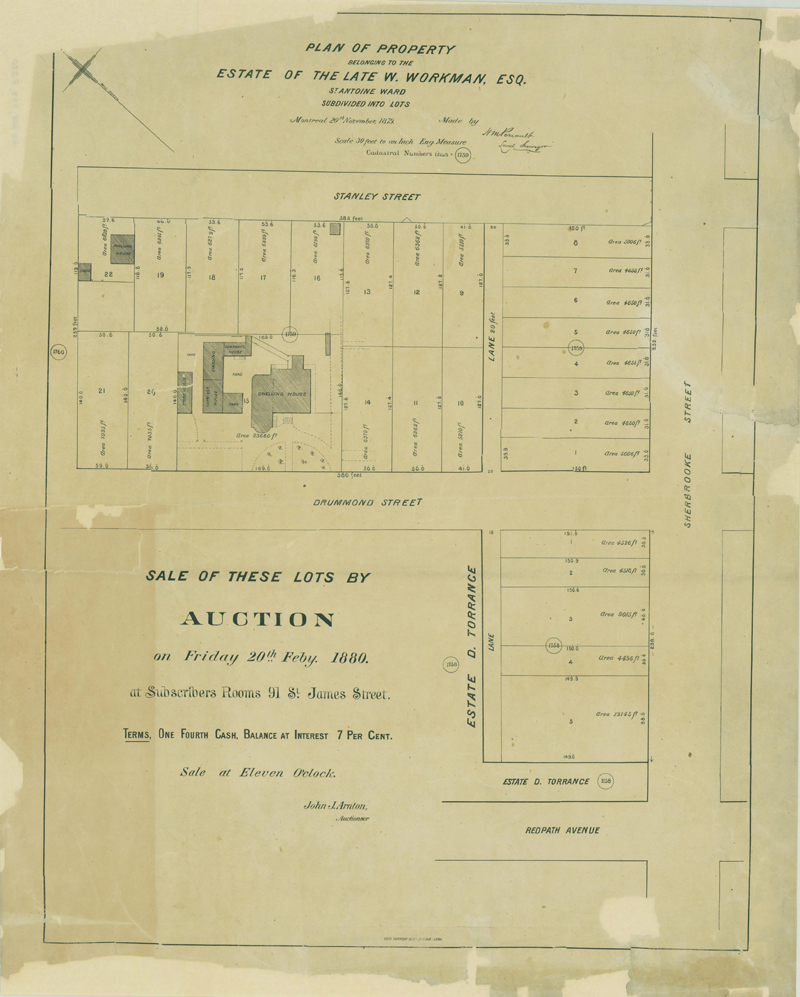 Around 1850, he and a business partner became real estate developers. They bought a piece of land south-west of Montreal’s city limits, near the Lachine Canal. The canal attracted industries such as brass foundries and rolling mills, and nearby manufacturing facilities belonging to Frothingham and Workman employed hundreds of people. The partners laid out streets, built sewers and divided the property into housing lots. The area, known as Sainte-Cunégonde, became a village in 1876 and a tiny independent city in 1890, but eventually it became part of the City of Montreal.5 Workman Street, named after William, still exists in the area.